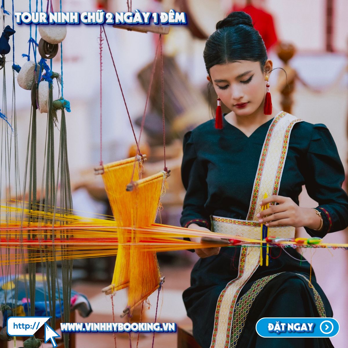 10h30 Tham quan làng dệt thổ cẩm Chăm Mỹ Nghiệp – Biểu tượng rực rỡ vàng son” của Champa-xứ Panduranga”. Đến đây, Quý khách tham quan trải nghiệm quy trình dệt thổ cẩm truyền thống, giao lưu trò chuyện cùng những nghệ nhân lành nghề và mua sắm những món đồ lưu niệm đẹp đẽ mang về làm quà cho người thân.